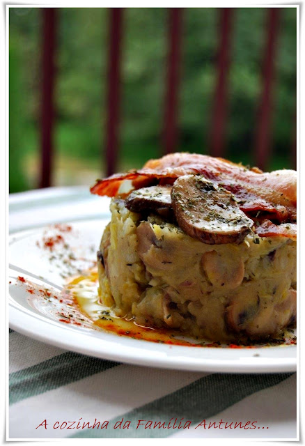 Entrada: Pastel de batata, bacon e cogumelos